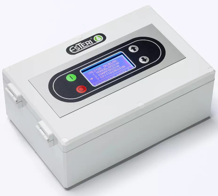 Kuivaushuoneen käyttöä helpottava Esteri NOK-näyttöohjain. Pyykin ripustamisen jälkeen laitteisto on mukava käynnistää käyntioven viereen asennetusta ohjaimesta.