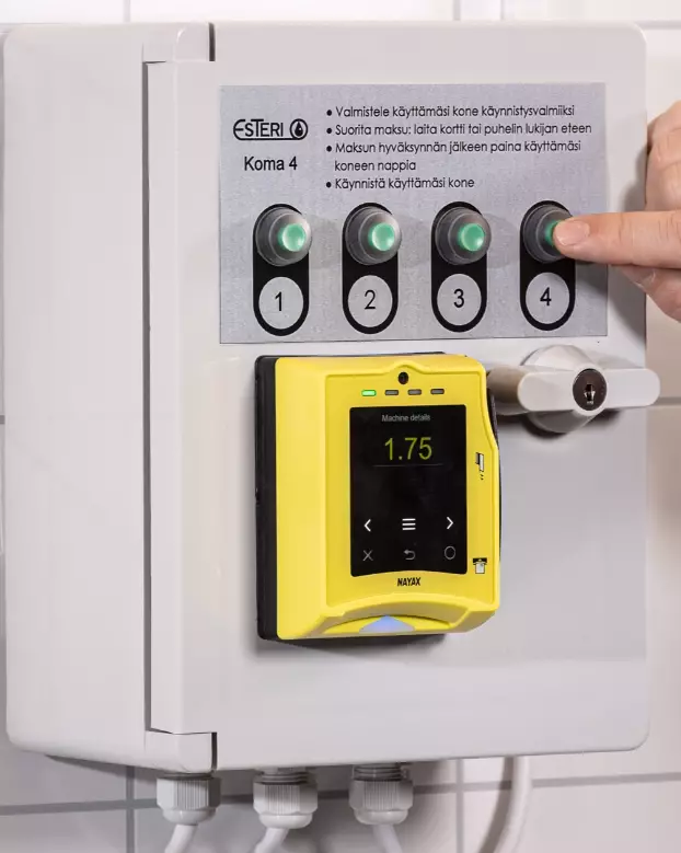 Esteri Koma 4 on suunniteltu käytettäväksi pesulan laitteiden maksamiseen ja on kytkettävissä kaiken merkkisiin ja ikäisiin pesukoneisiin, kuivausrumpuihin, mankeleihin jne. Esteri Koma 4:llä voidaan hoitaa enintään neljää konetta.