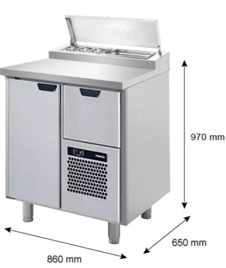 pizzojen valmistukseen. Kannen takaosassa on saranoidulla pisarasuojalla varustettu GNmitoitettu jäähdytetty allas.